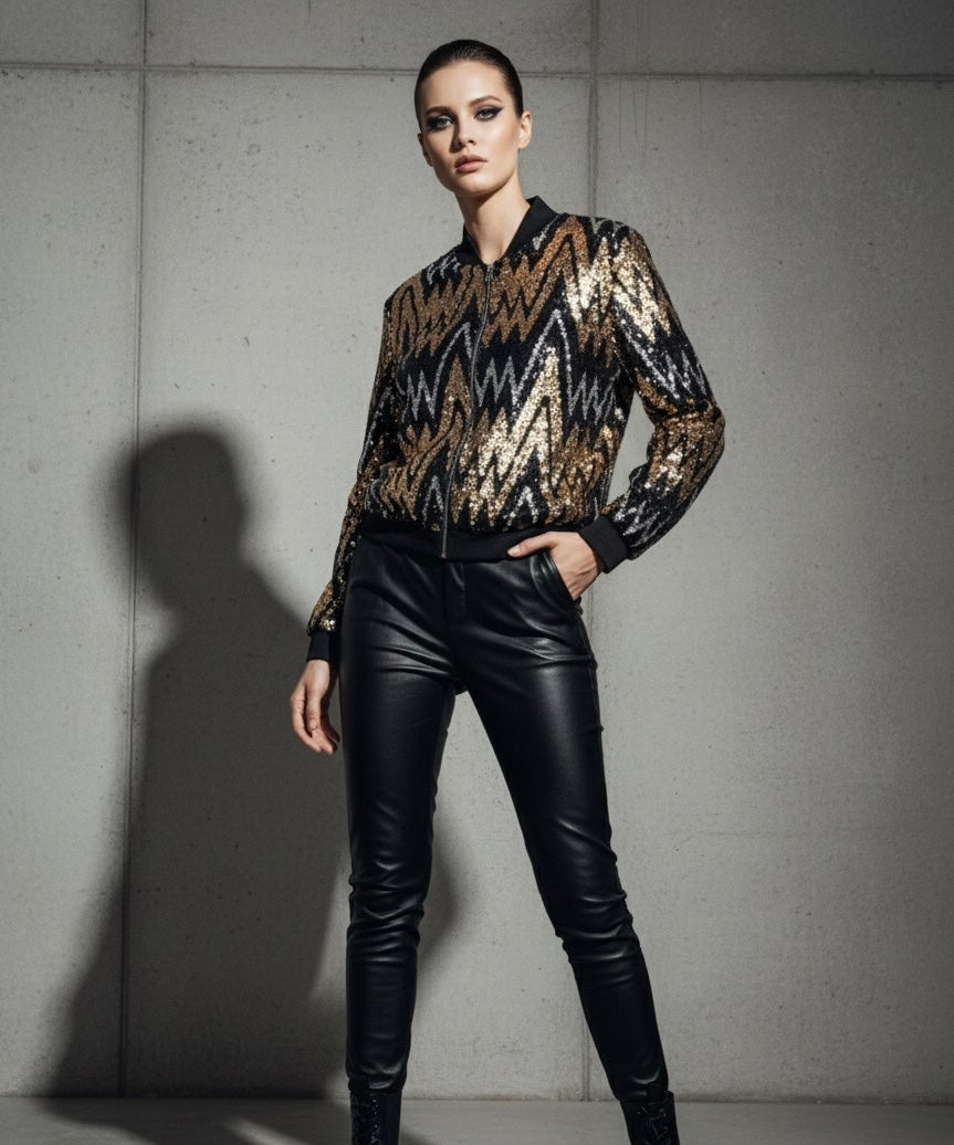 sequin bomber jacket with a black, gold, and silver chevron pattern